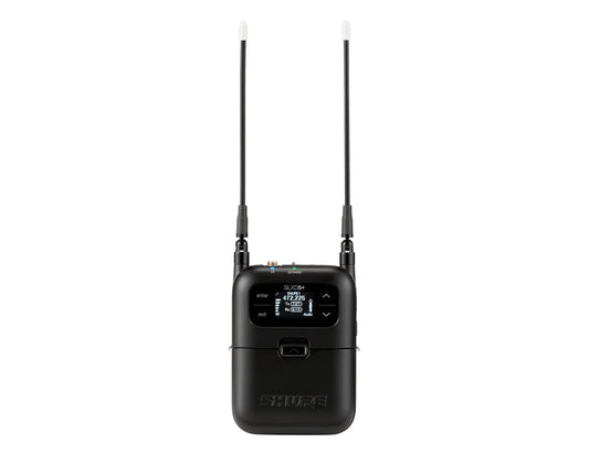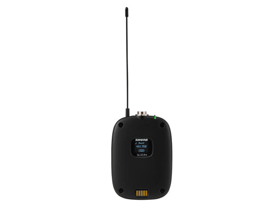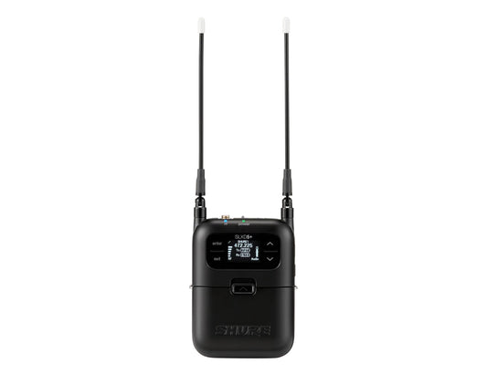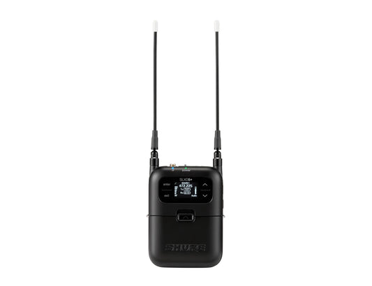 Shure SLXD1+ digital bodypack transmitter with 24 bit/48 kHz audio conversion, Bluetooth remote monitoring and control, high pass filter, 118 dB dynamic range, TA4M connector, external charging contacts, up to 138 MHz tuning range, includes carrying bag and 2x AA batteries (optional: SB903 rechargeable Li-Ion battery)