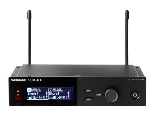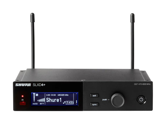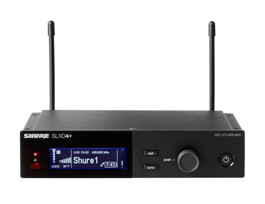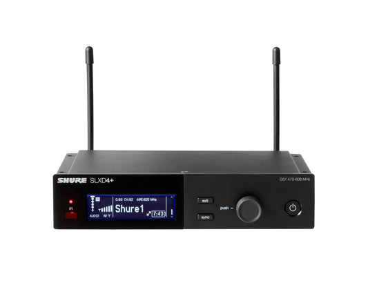 Shure SLXD4+ digital 1-channel receiver with 24 bit/48 kHz audio conversion, Bluetooth remote monitoring and control, networkable, up to 138 MHz tuning range, includes 19'' rack mount kit, 2x 1/4-wave antennas and 2x short BNC cables for front mounting