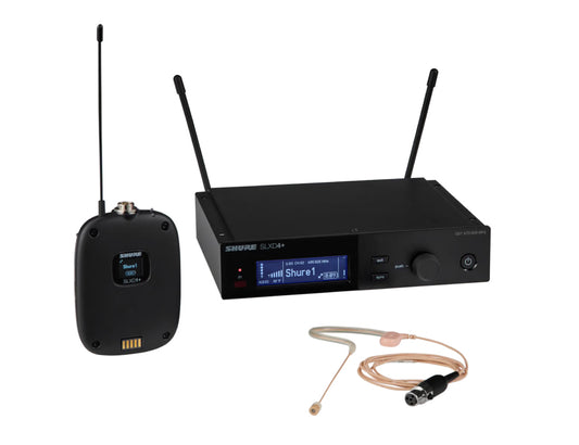 Shure SLXD14+/SM35 digital 1-channel wireless system, includes 1x SLXD4+ receiver with 19'' rack mount kit, 1x SLXD1+ bodypack transmitter with SM35 cardioid headset microphone, 2x 1/4-wave antennas, 2x short BNC cables for front mounting and 1x carrying bag