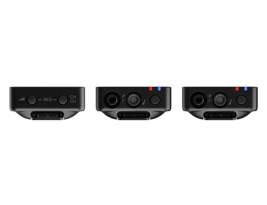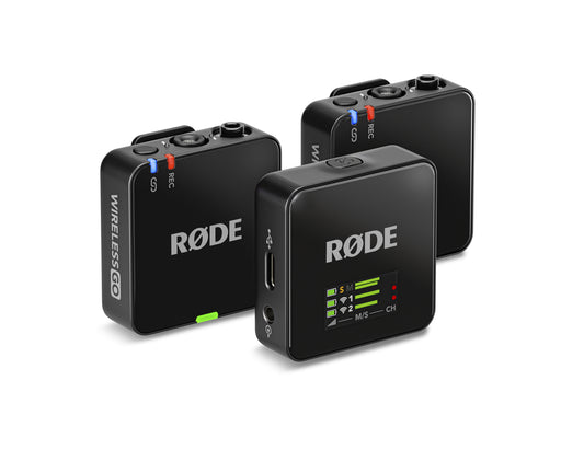 Rode Wireless GO III compact wireless microphone system, incl. 2x TX transmitter with built-in microphone and on-board recording, 1x RX dual channel receiver, 3x fur windshield, pouch, SC21 USB-C to Lightning cable, SC22 USB-C to USB-C cable, SC33 charging hub and SC2 3.5mm plug output cable
