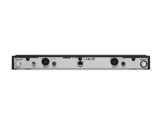 Shure SLXD4E digital receiver with 19'' rack mount kit, includes two 1/4-wave antennas and short BNC cables for front mounting, with 24 bit/48 kHz audio conversion and 120 dB dynamic range, 44 MHz tuning bandwidth, mic/line level switchable